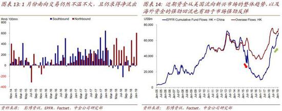 虽然1月份沪港通南下的资金依然相对疲弱,全月仍录得净流出,但海外资金的持续回流对港股市场表现提供了支撑,这与近期资金在美国与新兴市场之间的轮动趋势也相一致。