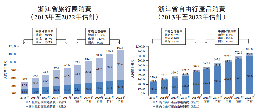 随着旅游产业刺激政策的推出和旅游基础设施完善,浙江省的旅游市场增速高于全国平均,预计2022年全省旅游消费支出在全国的占比将进一步提高至11.1%。