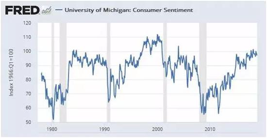 作为零售消费品公司,他们面临着消费者支出减少的风险。一个经常被引用的指标是密歇根大学制作的消费者情绪。该指标通常被认为是一个领先指标,如下所示,可追溯到1980年以前。