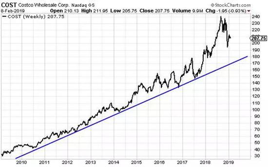 考虑到好市多的股票价格和弱势经济中的相对盈利强度,我认为如果熊市持稳,该股有望抵御大幅下跌。其股票图表上显示的趋势线可能提供支撑。如果不是那么在2015年市场疲软期间看到的一般交易区间(低于130美元)可能会提供一些支撑。