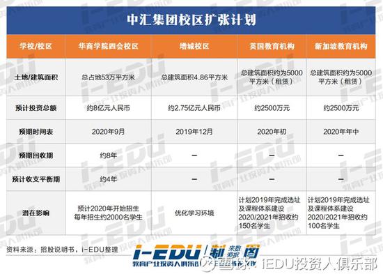 根据招股说明书披露的内容,中汇集团将通过在大湾区建立新学校、校区或进行收购以扩大学校容量,并进一步推动多元化课程设置和改善现有教学设施。其中,中汇集团已经确定将建设包括四会校区、增城校区、英国教育机构和新加坡教育机构在内的四个校区,预计总投资金额约为11.25亿元人民币,校区基本在2020年投入使用,预计当年新招生人数约为2500名。