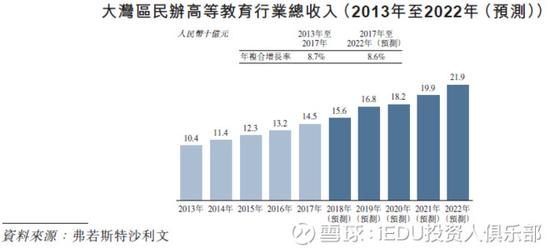 根据弗若斯特沙利文统计,大湾区民办高等教育行业总收入自2013年的104亿元增长至2017年的145亿元,年复合增长率为8.7%。预计到2022年,大湾区民办高等教育行业总收入将达到219亿元,自2013年起的年复合增长率将超过8.6%。