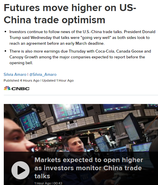 新浪美股讯 北京时间2月14日消息 美国股指期货周四盘前走强,投资者继续对贸易谈判前景持乐观态度。针对美国欲延期60天对中国加征关税的报道,商务部新闻发言人回应称,等到中美经贸高级别磋商结束之后,会有一个更好的答复。