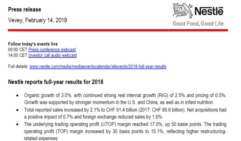 财报显示,雀巢2018年销售额增长2.1%,至914亿瑞士法郎;净利润增长41.6%,达到101亿瑞士法郎;每股收益达到3.36瑞士法郎,同比增长45.5%。