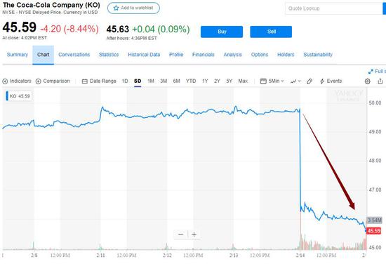 可口可乐四季度业绩大致符合华尔街预期,但全年的业绩指引逊色,股价暴跌,创后金融危机时代最大跌幅。