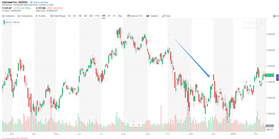 四季度,Alphabet股价震荡下行,并于年底跌至两年新低。