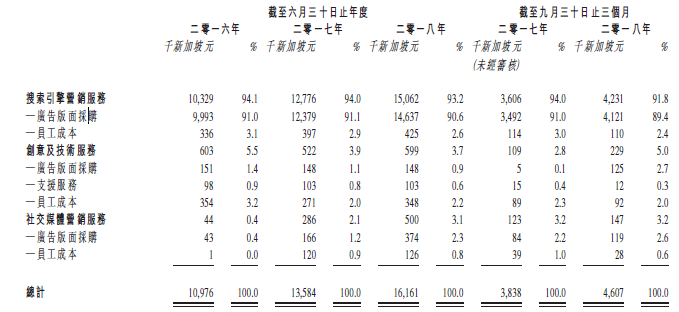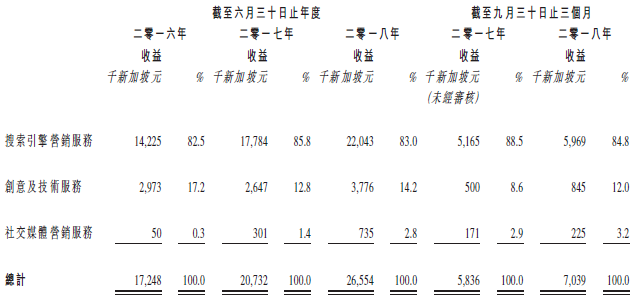17财年、18财年及19财年3个月分别实现收益2073.2万、2655.4万及703.9万新加坡元,同比收入增速分别约为20.2%、28.1%及20.6%,分部中搜索引擎营销占比相对稳定,社交媒体营销业务飞速增长。