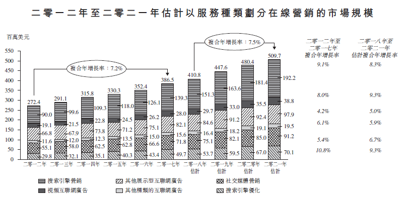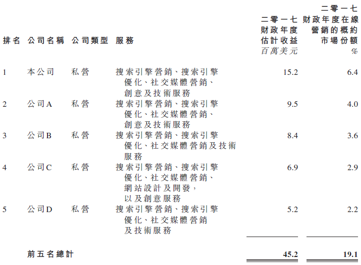 第二大业务创意及技术服务主要涉及搜索引擎优化(采用统计监测手段进行非付费搜索优化)、网站开发及寄存(网站定制及维护更新以提升曝光),还包括其他服务(通过客户印刷出版品投放印刷广告);
