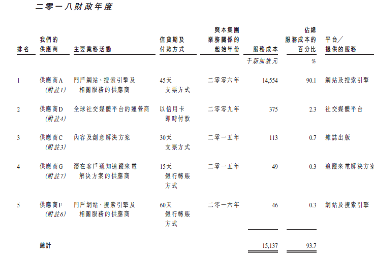 分析服务成本分项,核心业务广告版面采购费比例超过90%,支付对象为合作的搜索引擎平台及社交媒体平台。整体而言,期间约89.2%、90.6%、90.1%、90.3%及88.8%的服务成本支付予最大供应商谷歌。