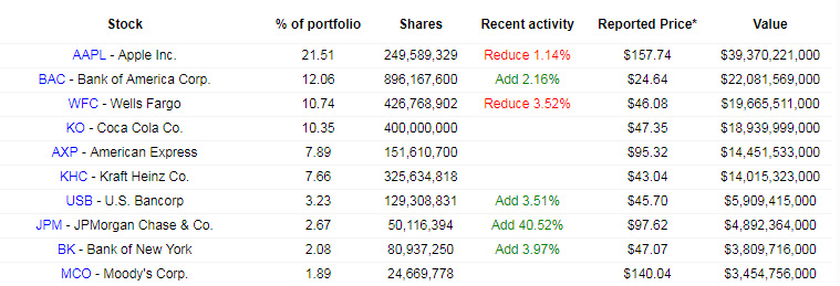 伯克希尔·哈撒韦公司2018年第四季度前十大持仓