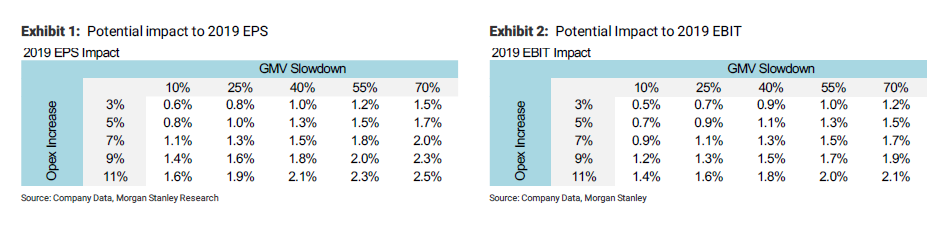 大摩预计随着Flipkart的增速放缓及合规方面带来的成本增加,将对拖累沃尔玛EBIT 1.5%,EPS 1.5%(中位数)。