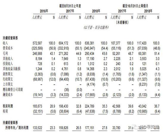 根据招股书,2016年、2017年及2018年截至8月31日止年度,中汇集团的收入分别为5.73亿元人民币、6.04亿元人民币、6.36亿元人民币,年复合增长率为5.4%。其对应的持续经营业务的年内溢利分别为1.34亿元人民币、1.60亿元人民币、1.77亿元人民币,年复合增长率为15.2%。