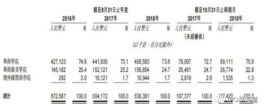 对于国内两所民办学校,集团要求学生及其家长提前支付整个学年的学费及住宿费,正因为如此,收入中超过97%来源于国内运营的这两所学校,其中73%以上来源于华商学院。2015/2016、2016/2017、2017/2018学年期间,华商学院分别实现收入4.27亿元人民币、4.42亿元人民币和4.69亿元人民币,分别占总收入的74.6%、73.1%及73.6%;华商职业学院分别实现收入1.45亿元人民币、1.52亿元人民币和1.57亿元人民币,分别占总收入的25.4%、25.2%及24.7%。
