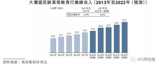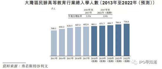 就大湾区来看,根据弗若斯特沙利文的分析,大湾区民办高等教育行业总入学人数自2013年的56.8万人增长至2017年的65.3万人,年复合增长率达到3.5%。据其预测,到2022年,大湾区民办高等教育行业总入学人数将达到71.9万人,自2017年至2022年的复合增长率为1.9%。