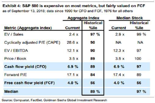 估值因素是影响和限制宽松政策影响力的重要原因。2009年美联储启动首次量化宽松之时,美国股市刚经历了超过40%的回调,个股估值水平远低于历史均值。在宽松的货币政策及投资者情绪逐渐恢复后,随之而来的是延续至今的十年大牛市,估值水平也在水涨船高。高盛在去年9月给出了标普500指数七大估值指标与历史均值的比较,有意思的是美股也在10月初见顶。
