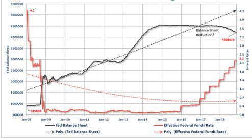 从2016年12月起美联储加息进入快车道,2017年9月20日,美联储宣布从当年10月开始按计划缩减资产负债表规模,采取被动缩表方式逐步减少到期再投资。最新数据显示,美联储的资产负债表规模已经缩减4020亿美元,降至4.0580万亿美元。如果美联储现在暂停加息和缩表,摆在鲍威尔面前的局面与当时的伯南克有很大的差异,2008年初联邦基金利率为4.2%,资产负债表为9150亿美元。如今联邦基金利率区间为2.25-2.5%,资产负债表规模已经扩张了近四倍,留给美联储的政策空间已相对有限。