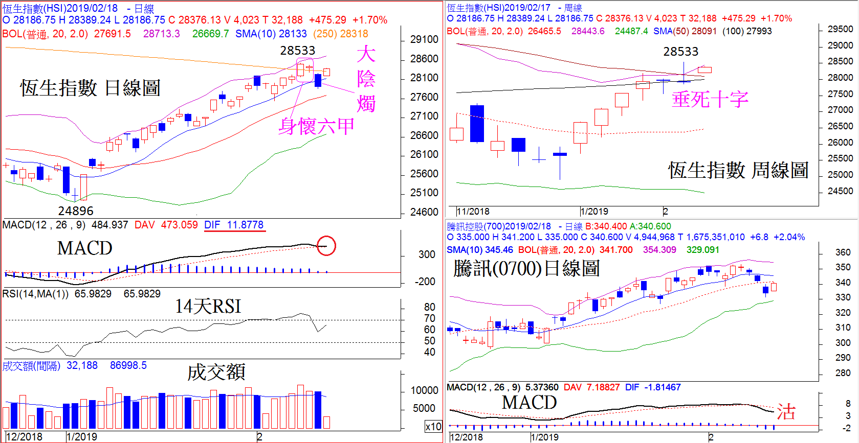 縱然恆指今早扭轉上周五的跌勢,但若果單從陰陽燭形態來看,卻有條件在2月13日的28533見頂:首先,恆指上周先創新高後靠近於全周最低位收市,在周線圖上形成了「垂死十字」的見頂形態,其收市價亦同時受制於三大阻力:20星期保力加通道上限線、100周線及50周線;其次,從日線圖看,恆指在28533見頂之後,亦呈現出「身懷六甲」的初步轉向形態,當上周五以大陰燭跌穿10天平均線支持低收之後,「身懷六甲」的轉向形態已獲得確認;最後,重磅股騰訊(0700)上周五已失守20天平均線,加上MACD已發出明確的沽售訊號,短期走勢已明顯轉淡,今早的升勢應該只屬於反彈。較大阻力是20天平均線341.70元及10天平均線345.50元。