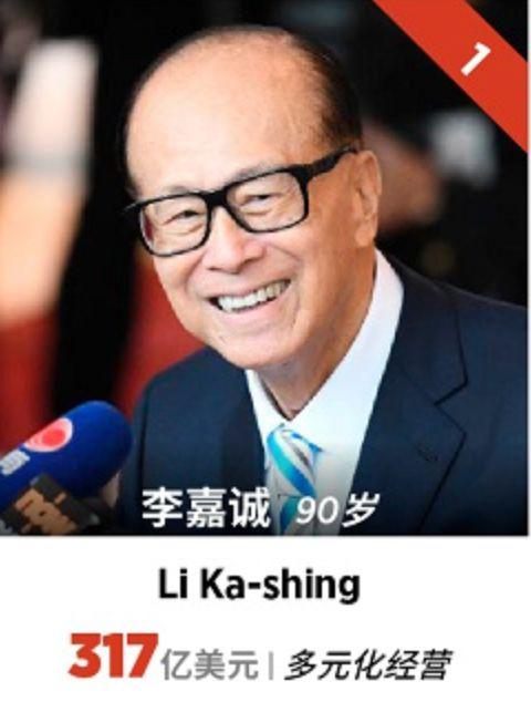 李嘉诚仍在该榜单上名列首位,尽管他的财富缩水了40亿美元,至317亿美元。
