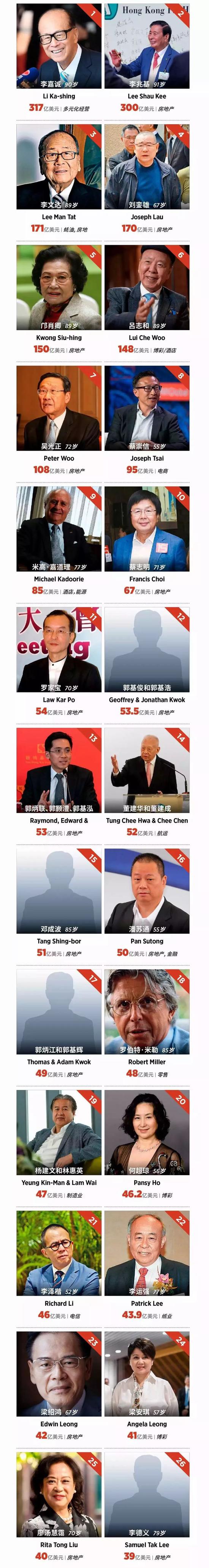 以下为最新福布斯香港富豪榜单,图片来源:微信公众号福布斯(foebes_china)。
