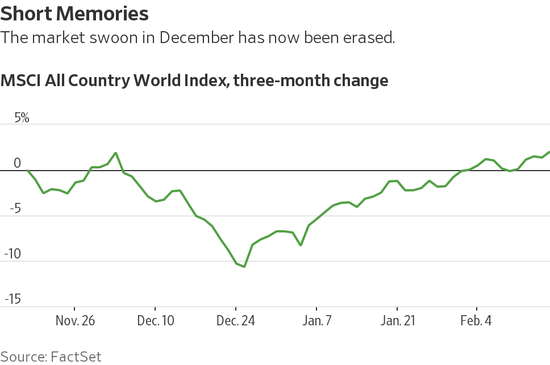 MSCI明晟所有国家全球指数(MSCI All Country World Index)已抹去2018年底恐慌情绪下出现的跌幅,当时,围绕全球利率攀升和经济增长放缓的担忧引发股市急跌。上周五,该指数收盘水平略高于去年12月3日收盘点位。本周一亚洲股市大多延续升势。美国金融市场周一因假日休市。