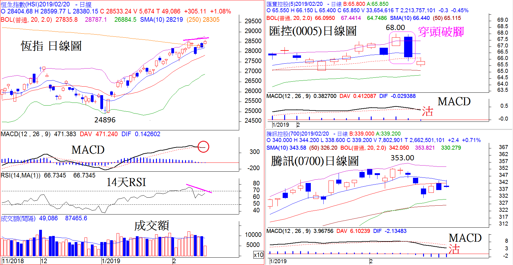 其次,兩大重磅股匯控(0005)和騰訊(0700)都比起大市弱,即兩大重磅股與大市出現「頂背馳」。以匯控為例,昨日受利淡消息而下挫,最終以「穿頭破腳」的見頂形態低收,今早亦失守20天平均線,加上MACD已發出沽售訊號,短線見頂訊號強烈;至於騰訊方面,連續兩天的反彈都受制於10天及20天平均線後抽阻力,弱勢沒有扭轉跡象。