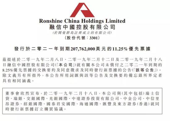 据公告,2019年2月18日,融信中国与瑞士信贷、瑞银、交银国际等机构就同时发行新票据订立购买协议。公司发行的新票据,目的在于为公司若干现有债务进行再融资。
