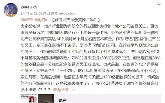无独有偶,就在签订协议的前一天,2月17日,名为@ZekeQkS 的网友发微博称,融信中国普通员工去年仅拿到工资的70%,超3成的绩效工资不知所踪。