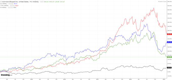 (动视暴雪、艺电、Take Two 5年股价表现与标普500指数对比图,来源英为财情)