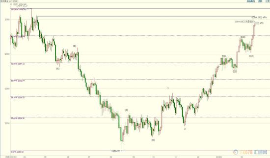3浪又可分为五子浪。在五浪结构中,第三浪通常不能比第一、第五浪都短。鉴于此判断,金价短线有望见顶。目前金价可能处于3浪中的第(v)浪,长度接近(iii)浪。