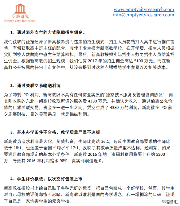 此外,格隆汇也第一时间联系到教育行业研究员,有研究员认为,从做空机构给出的4点做空理由来看(下图),第一点无从验证,也不知道它佣金估算5100万从何而来;第二点所说的收取服务费是VIE构架的正常操作;第三点新高教生师比确实较高;第四点并不能成为做空该公司的论据。