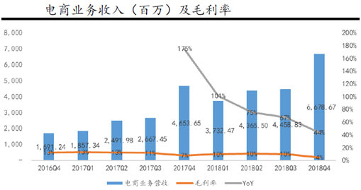 2018Q4电商业务占营收比例为33.7%,达到66.79亿元,收入增长稳健,主要得益于网易考拉和网易严选的快速发展。毛利率为4.5%,其下降主要原因是本季度促销力度较大。