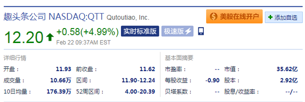 新浪科技讯 2月22日晚间消息,截至北京时间22:36,趣头条(NASDAQ:QTT)盘中涨近5%,报12.2美元,目前市值35.62亿美元。