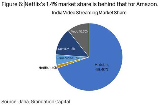 然而,Netflix自2016年推出以来一直难以在印度获得市场份额.Netflix仅占据了1.4%的视频流媒体市场,而亚马逊Prime则占据了5%。