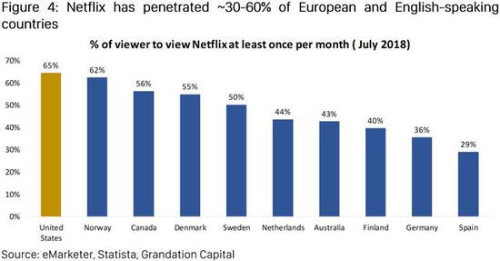 对于美国市场,我们认为Netflix将能够保持目前的市场份额。Netflix在美国拥有5800万用户,实现了60%的普及率,如果Netflix能够保持高质量的内容输出和稳定的订阅价格,即使他们打算订购另一种SVoD服务,大多数受众也可能会保留Netflix。