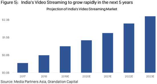 国际增长将放缓(印度):由于政府监管,Netflix以及谷歌和Facebook未能进入中国市场。这使得印度成为Netflix的最大潜力。事实上,Netflix的首席执行官声称其下一个1亿用户将来自印度。该国的流媒体营销正在快速增长,预计到2023年将达到23亿美元。