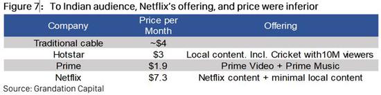 对于印度观众来说,Netflix太贵了,内容不够“本地”。在非英语国家,像Stranger Things&House of Cards这样的美国热门歌曲可能不会受到好评。为了打入国外市场,Netflix必须用当地语言创建本地节目。这对Netflix来说成本效率低,并且每个用户的内容成本更高。像印度这样的新兴市场的受众对价格非常敏感。Netflix的费用是印度当地有线电视公司的两倍,这使得Netflix难以获得市场份额,尽管其高质量的节目。