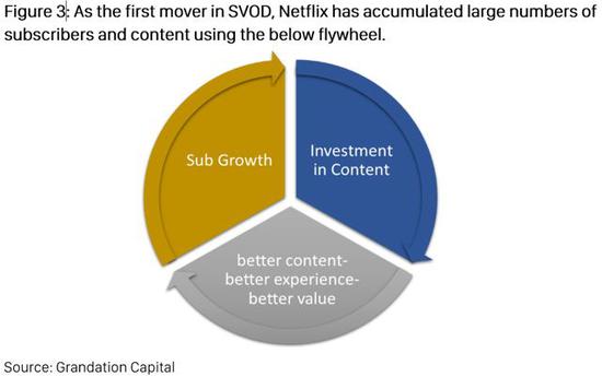 Netflix的飞轮。Netflix的快速增长主要归功于Netflix的参与飞轮,而Netflix则大量投入了原创内容; 更好的内容吸引更多订阅,Netflix投入大部分增加的现金流来产生更好的内容。