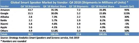 统计数据也证实这一情况。Strategy Analytics发布的2018第四季度全球智能扬声器出货量为3850万台,全年出货量超过8600万台。亚马逊继续成为智能扬声器出货量的全球领导者,并且已连续几个季度实现了增长。谷歌也有强劲的增长,并与亚马逊进一步缩小差距。