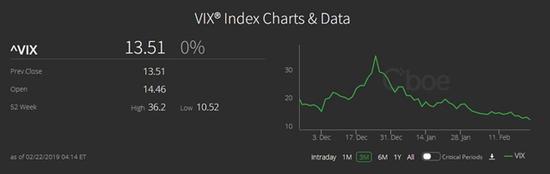 2019年以来,美国三大股指在不足两个月的时间内累计上涨超11%,创下1987年以来同期最佳表现。目前道指和标普距离历史高点仅有3%和4.7%的距离。伴随着股市的高歌猛进,代表着波动性的芝商所CBOE恐慌指数VIX则一路走低,已连跌九周,截至2月22日收盘已经回落至13.51,几乎较去年12月高点下跌近2/3。