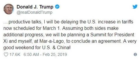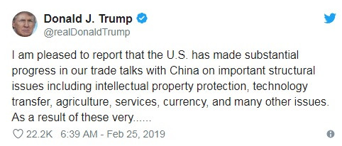 特朗普表示,“我很高兴地报告:美国在与中国的贸易谈判中就包括知识产权保护、技术转让、农业、服务业、汇率等重要结构性问题,以及很多其他议题取得巨大的进展。”并且推迟3月1日上调中国输美商品关税的计划。