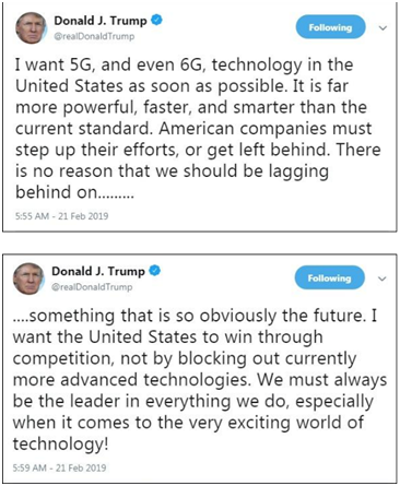 “我想要5G,甚至6G能尽快进入美国市场。这比目前的行业标准更强、更快、更灵活。美国公司必须加把劲,不然就会屈居人后。在这个毫无疑问代表着未来的领域,我们没有任何理由落后于人。我希望美国能够通过自由竞争取胜,而不是把更先进的技术拒之门外。我们要做各行各业的领头人,尤其是在精彩纷呈的科技世界!”