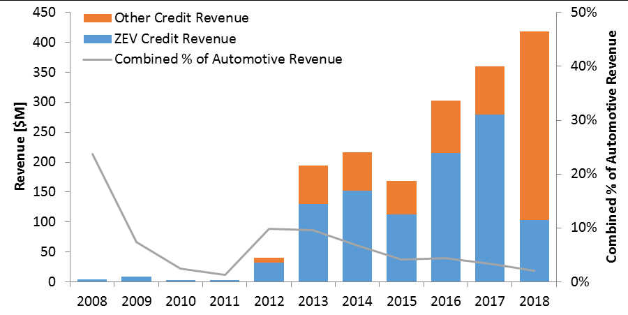 特斯拉一直有一项不为人知的收入项目,即监管类积分收入,这在2018年财报中有所体现,这部分收入主要来源于特斯拉向其他厂商出售ZEV(零排放车)和GHG(温室气体排放)积分。其中,ZVE积分是通过销售零排放电动车获得的,美国ZEV法案规定,不同表现的新能源车型可以得到不同的分数,一家汽车厂商所得分数不能低于所需达到的及格分数,否则将会面临罚款。目前该法案在美国10个州中实行,由于特斯拉是积分大户,而且积分是可以在厂商之间相互转换的,所以ZEV积分销售也成了特斯拉一部分重要的收入,其收入变化如下图所示。2018年总积分收入接近特斯拉电动车总收入收入的50%。