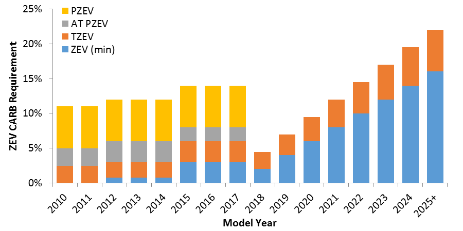 而从2018年车型开始,ZEV法案的要求明显更加严格。ZEV+TZEV车辆占比将逐年增加,2025年ZEV积分要求将达到22%,大约是2018年车型的5倍。同时2018年其AT-PZEV和PZEV将不再被认可为ZEV车型。而且平均每辆车所能获得的积分也将大幅减少,这意味着未来ZEV积分的获取将会越来越难,积分买卖需求将会越来越高。