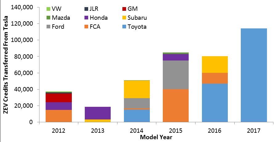 从历史上看,特斯拉获得积分后会立马转让给有兴趣的汽车厂商,根据特斯拉的季度ZEV积分转移报告,可以大致了解每个积分转移获得的收入数额,目前已经从原来的超过4000美元/积分下降到了2000美元/积分。