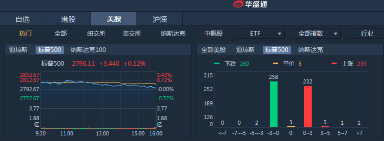 受贸易情绪推动,美股涨至近四个月新高。标普500指数收涨0.12%,报2796.11点。道指收涨0.23%,报26091.95点。纳指收涨0.36%,报7554.4。