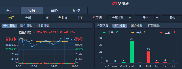 恒指早盘高开0.55%,随后宽幅震荡态势,一度站上两万九大关。截至收盘,恒生指数涨143点或0.5%,报28959.3点,全日成交额达1687.55亿。国企指数涨1.78%,报11631.03点,红筹指数跌0.53%,报4559.71点。