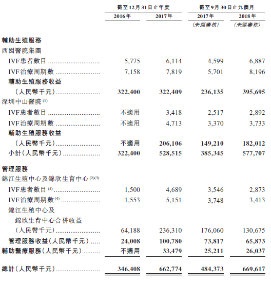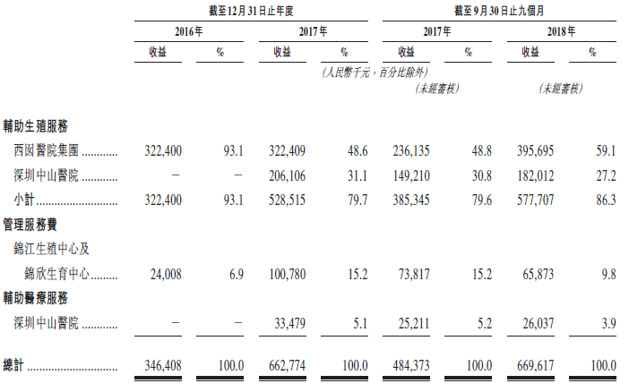 具体而言,公司收入除了辅助生殖服务、还有管理服务及辅助医疗服务,截至2018年9月30日止九个月,辅助生殖服务收入5.78亿元,占总收入86.3%,管理服务费为6587.3万元,占比9.8%,辅助医疗服务为2603.7万元,占比3.9%。