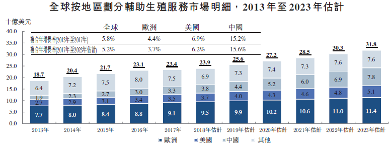 由于不孕症的增长,全球辅助生殖需求也将不断增长,全球辅助生殖服务市场由2013年的187亿美元增长至2017年的234亿美元,复合年增率为5.8%,预计于2023年进一步增长至到318亿美元,自2017年起计的复合年增长率为5.2%。