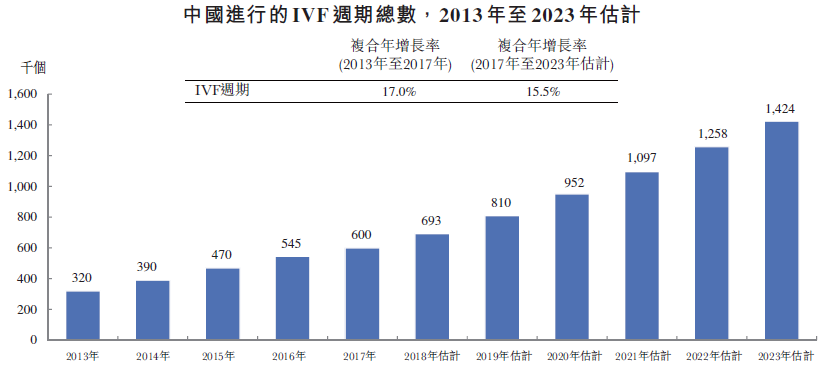 据招股书,中国2017年大约有4770万对不孕症夫妇,不孕症患病率达到15.5%,预期将于2023年增加至5620万对,患病率达到18.1%,而2017年只有52.7万名患者在中国接受辅助生殖服务,并预期于2023年增加至95.6万名,复合年增长率达到10.4%。具体上,国内进行IVF治疗周期数将会大幅增长,预计在2023年达到142.4万个。按照2017年15.5%、2023年18.1%的不孕症患病率来看,中国2017年每7对夫妇中就有一对无法生育,而2023年将会达到每6对就有一对无法生育。
