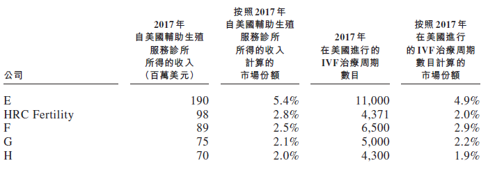 而美国辅助生殖服务市场相对分散,主要由私营医院机构组成,以2017年来自辅助生殖服务诊所的收入及所进行的IVF治疗周期计,HRC分别是美国市场的第二大及第五大参与者,市场份额分别为2.8%及2.0%。